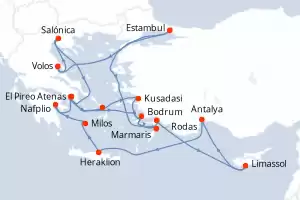 Grecia,Turquía,Chipre Itinerario: El Pireo Atenas , Bodrum , Marmaris , Limassol , Antalya , Heraklion , Milos , Nafplio , El Pireo Atenas , Mykonos , Kusadasi , Rodas , Estambul , Estambul , Volos , Salónica , El Pireo Atenas Comidas incluidas EXPLORA II 21 días Suite El Pireo Atenas 09/11/2026 desde US$10780 Comidas incluidas Ver las ofertas