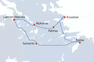 Turquía,Grecia Itinerario: Lavrion (Atenas) , Mykonos , Patmos , Kusadasi , Rodas , Santoríni , Lavrion (Atenas) Comidas incluidas Celestyal Discovery 5 días Camarote estándar Lavrion (Atenas) 01/11/2027 desde US$859 EL PRECIO NO INCLUYE LA PERCEPCIÓN DEL 30% DE AFIP - RG 5463 TARIFA NO REEMBOLSABLE Comidas incluidas Otros puertos de embarque : Kusadasi Otras fechas : 22 mar. 27 Ver las ofertas