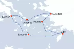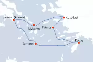 Turquía,Grecia Itinerario: Kusadasi , Patmos , Rodas , Santoríni , Lavrion (Atenas) , Mykonos , Kusadasi Comidas incluidas Celestyal Discovery 5 días Camarote estándar Kusadasi 16/11/2027 desde US$680 EL PRECIO NO INCLUYE LA PERCEPCIÓN DEL 30% DE AFIP - RG 5463 TARIFA NO REEMBOLSABLE Comidas incluidas Otros puertos de embarque : Lavrion (Atenas) Otras fechas : 27 oct. 26 30 mar. 27 9 nov. 27 Ver las ofertas