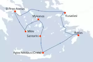 Turquía,Grecia Itinerario: El Pireo Atenas , Kusadasi , Rodas , Agios Nikolaus (Crete) , Santoríni , Mykonos , Mykonos , Milos , El Pireo Atenas Comidas incluidas Celestyal Journey 8 días Camarote estándar El Pireo Atenas 06/11/2027 desde US$978 EL PRECIO NO INCLUYE LA PERCEPCIÓN DEL 30% DE AFIP - RG 5463 TARIFA NO REEMBOLSABLE Comidas incluidas Otras fechas : 25 abr. 26 9-16-23-30 mayo 26 4-18 jul. 26 Otras fechas Ver las ofertas