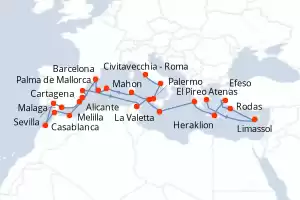 Grecia, Italia, Túnez, Turquía, España, Chipre, Marruecos, Malta Itinerario: El Pireo Atenas , Limassol , Rodas , Efeso , Heraklion , Katakolon , La Valetta , Trapani , Cagliari , Mahon , Palma de Mallorca , Barcelona , Cartagena , Malaga , Sevilla , Casablanca , Tánger , Melilla , Alicante , Valencia , Tunez , Palermo , Salerno , Civitavecchia - Roma Comidas incluidas Oceania Allura 27 días Camarote balcón El Pireo Atenas 08/12/2027 desde US$11548 EL PRECIO NO INCLUYE LA PERCEPCIÓN DEL 30% DE AFIP - RG 5463 TARIFA NO REEMBOLSABLE Comidas incluidas Ver las ofertas