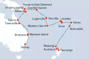 Australia, Nueva Zelanda, Tonga, Papúa Nueva Guinea, Fidji (islas), Vanuatu Itinerario: Sidney , Moreton island , Brisbane , Townsville , Cairns , Alotau , Conflict Islands , kiriwina Island , Honiara (Islas Salomon) , Luganville , Port Vila , Mystery Island , Lautoka , Suva , Isla Dravuni , Vavau , Nukualofa , Waitangi , Tauranga , Auckland Comidas incluidas Noordam 29 días Camarote estándar Sidney 04/01/2026 desde US$4955 EL PRECIO NO INCLUYE LA PERCEPCIÓN DEL 30% DE AFIP - RG 5463 TARIFA NO REEMBOLSABLE Comidas incluidas Ver las ofertas