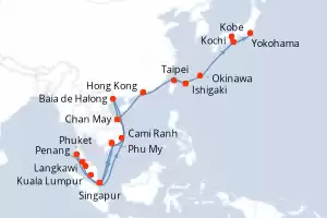 Sudeste Asiático con Japón Itinerario: Singapur , Kuala Lumpur , Langkawi , Penang , Phuket , Cami Ranh , Baia de Halong , Baia de Halong , Baia de Halong , Chan May , Phu My , Singapur , Phu My , Chan May , Hong Kong , Taipei , Ishigaki , Okinawa , Kochi , Kobe , Yokohama Comidas incluidas Diamond Princess 32 días Camarote estándar Singapur 13/02/2027 desde US$4673 EL PRECIO NO INCLUYE LA PERCEPCIÓN DEL 30% DE AFIP - RG 5463 TARIFA NO REEMBOLSABLE Comidas incluidas Ver las ofertas